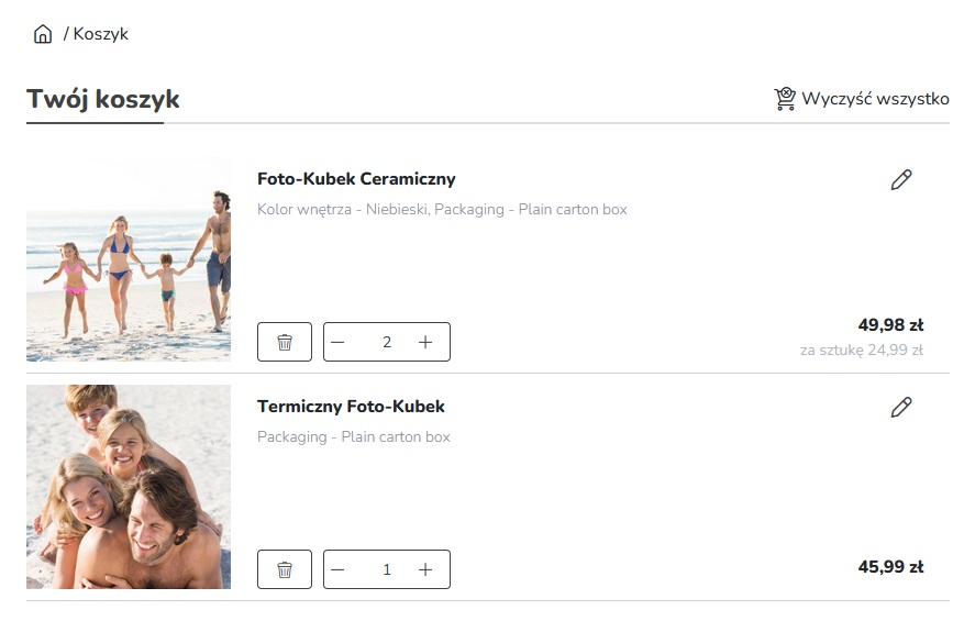 Kategoria, w ramach której chcemy włączyć grupowe naliczanie rabatów, to Foto-Kubki. Wewnątrz tej kategorii znajduje się Kubek termiczny (którego cena podstawowa to 49,90 zł) oraz Kubek ceramiczny (którego cena podstawowa to 26,99 zł).